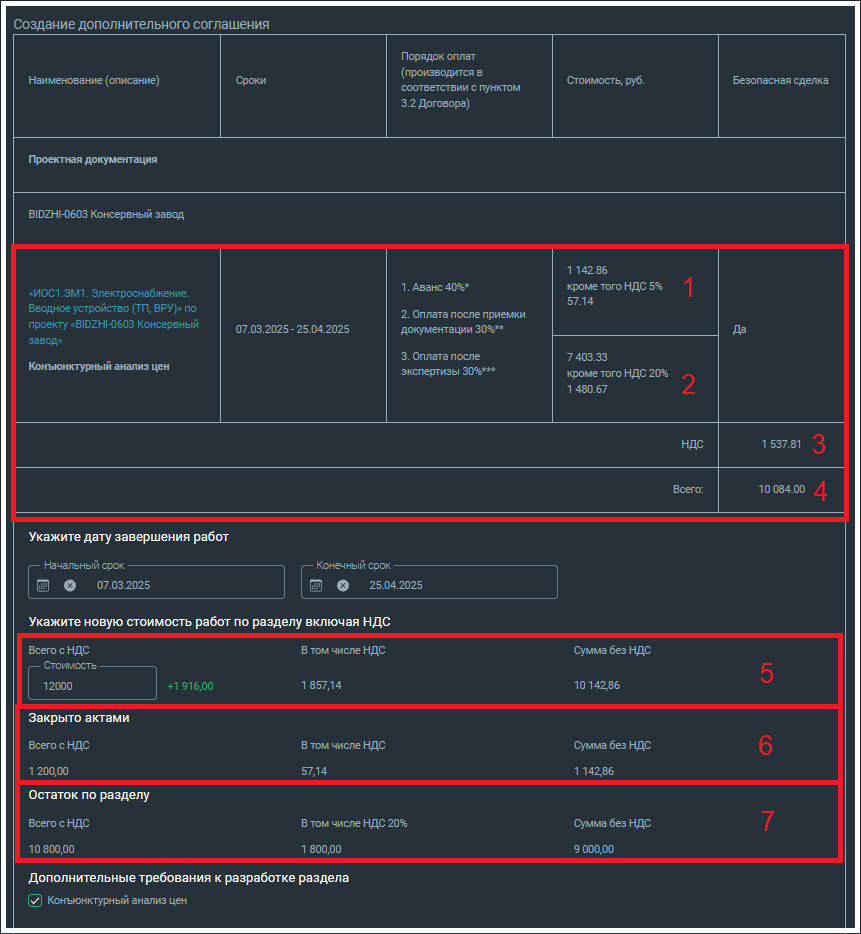 Цифрой 5 на рисунке обозначена область в которой производится перерасчет полной стоимости по разделу. На примере введена сумма 12 000.00 руб., соответственно платформа показывает на сколько изменена стоимость раздела (+1916,00 руб. в том числе НДС), а также рассчитан общий НДС и сумма без НДС.