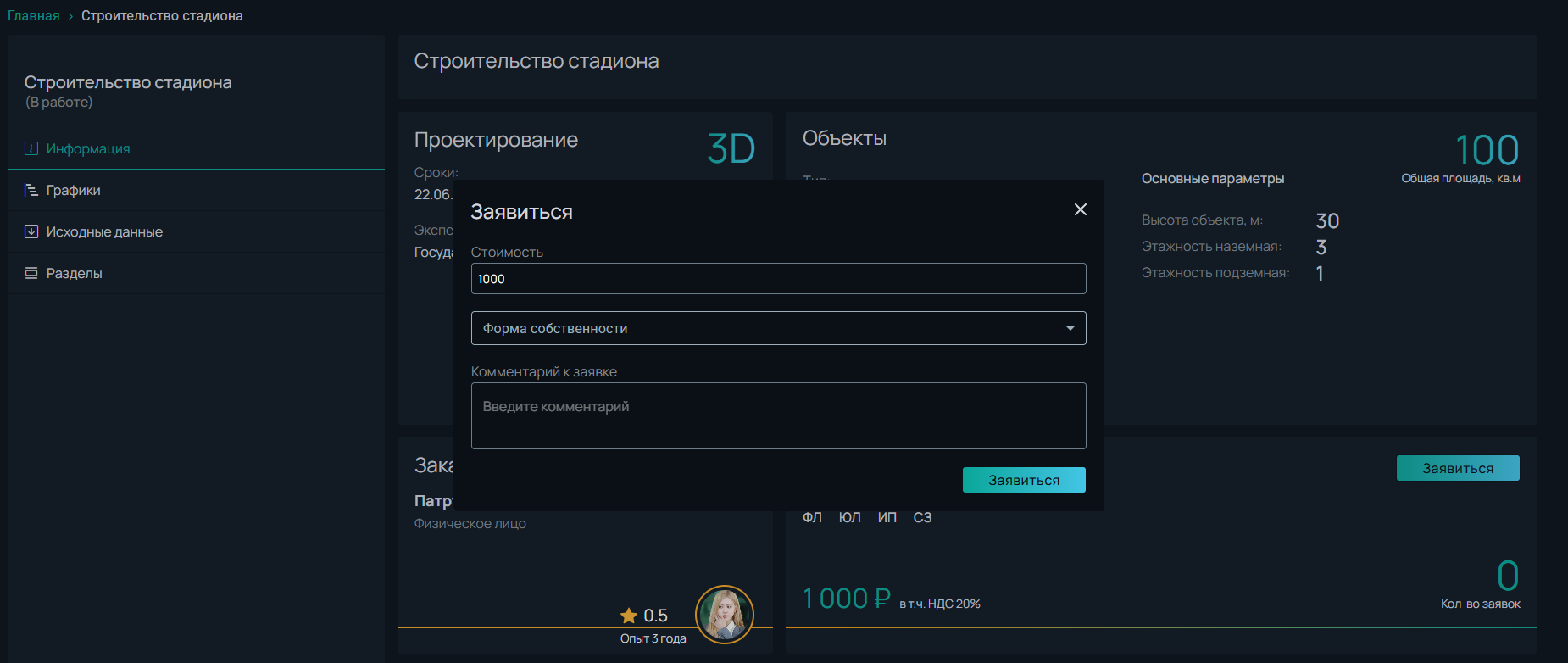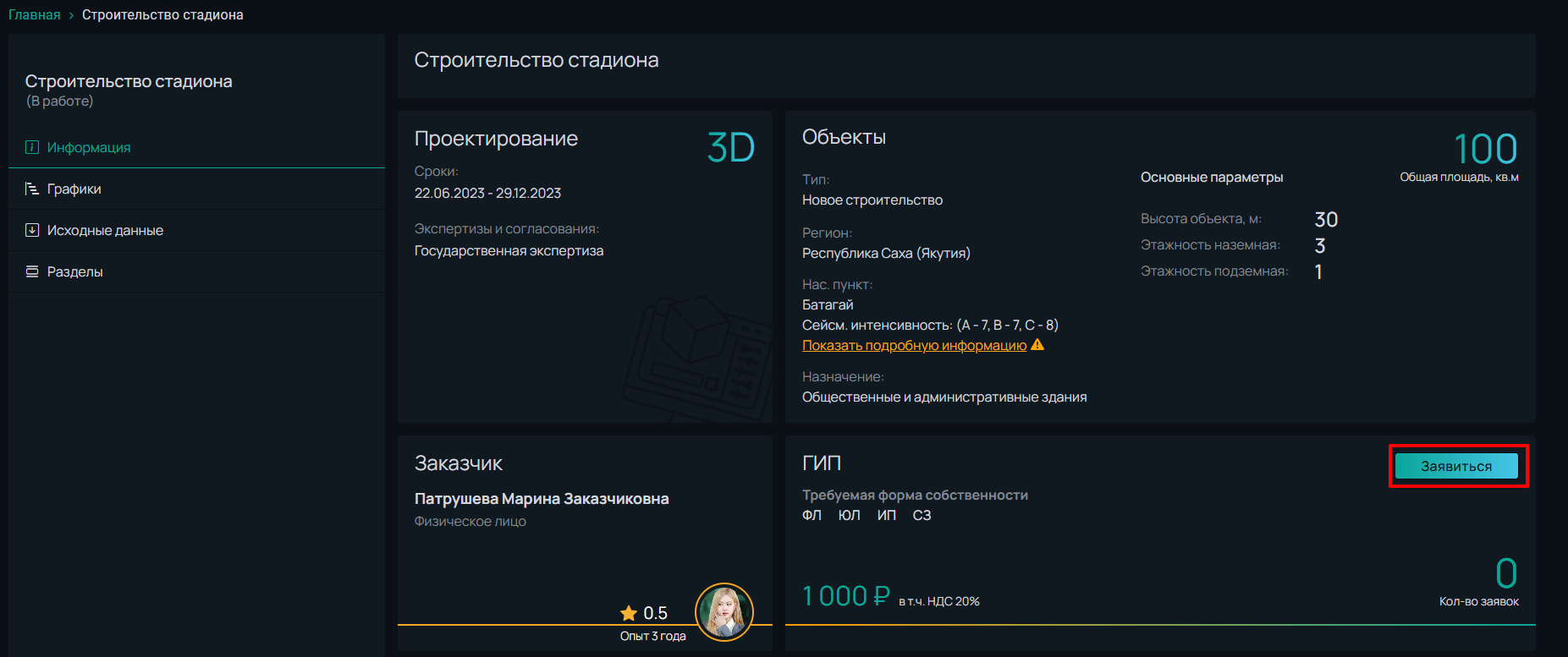 Перейдя на страницу проекта по ссылке в уведомлении, ГИП может ознакомиться с условиями и если условия ему подходят, нажать на кнопку **Заявиться.**