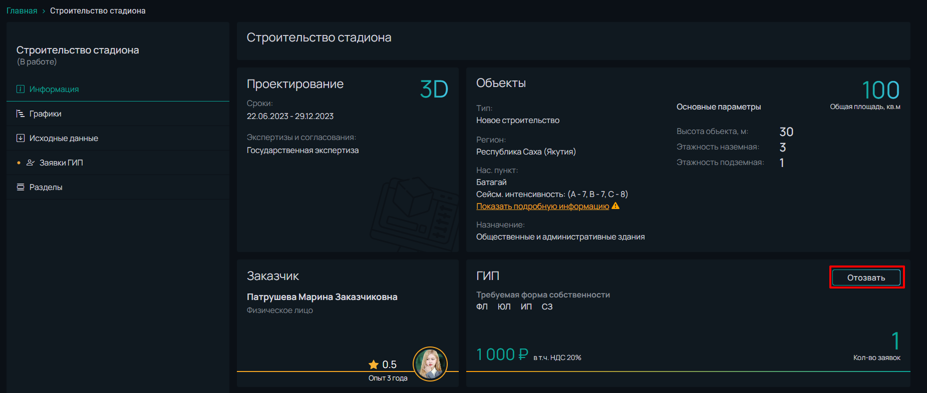 Отзыв заявки возможен, если *Заказчик* еще не выбрал ГИПа.