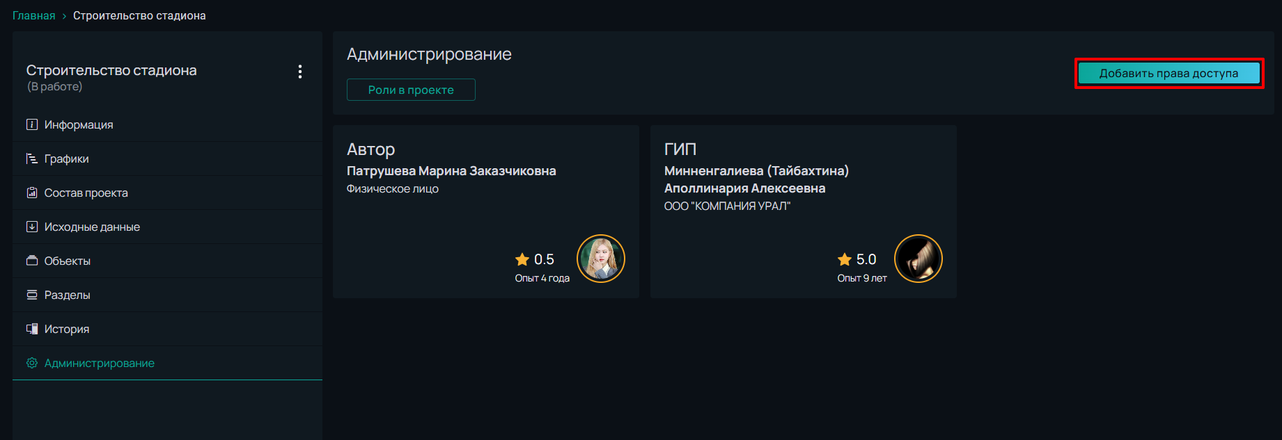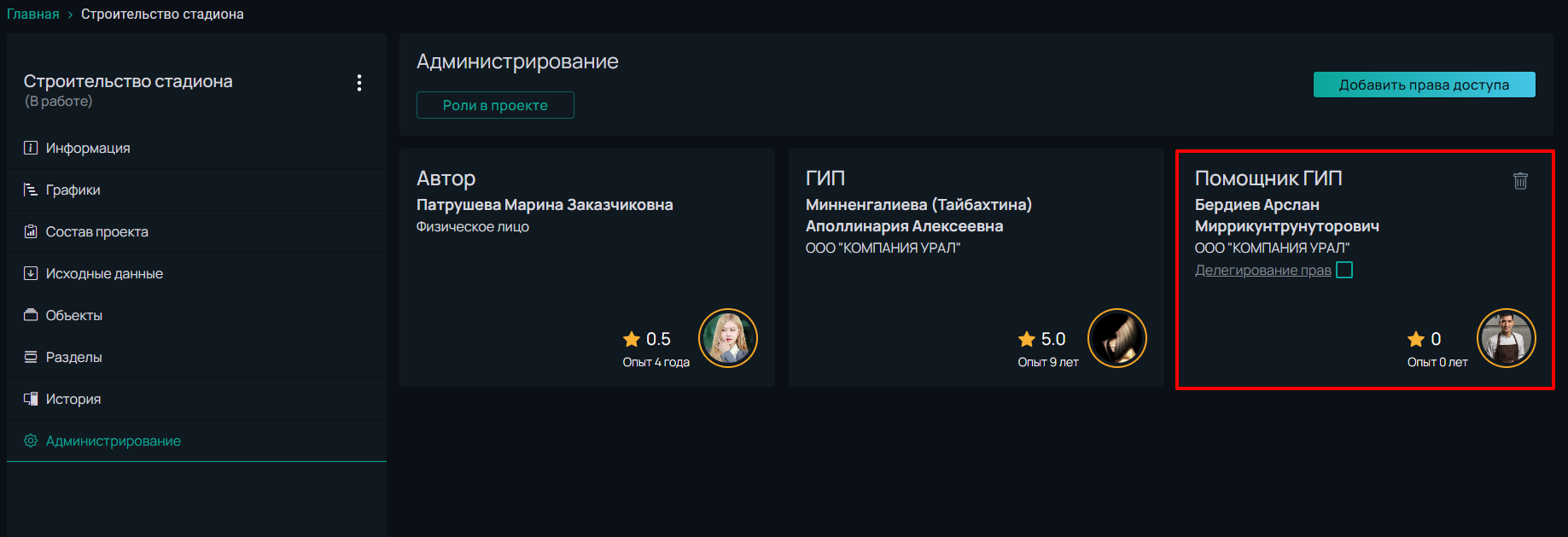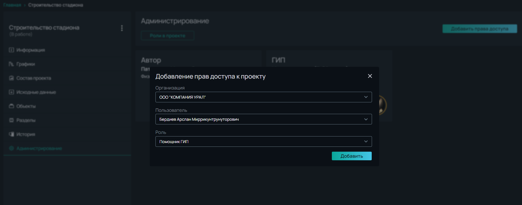 Назначение помощника ГИП происходит на вкладке проекта Администрирование по кнопке Добавить права доступа.