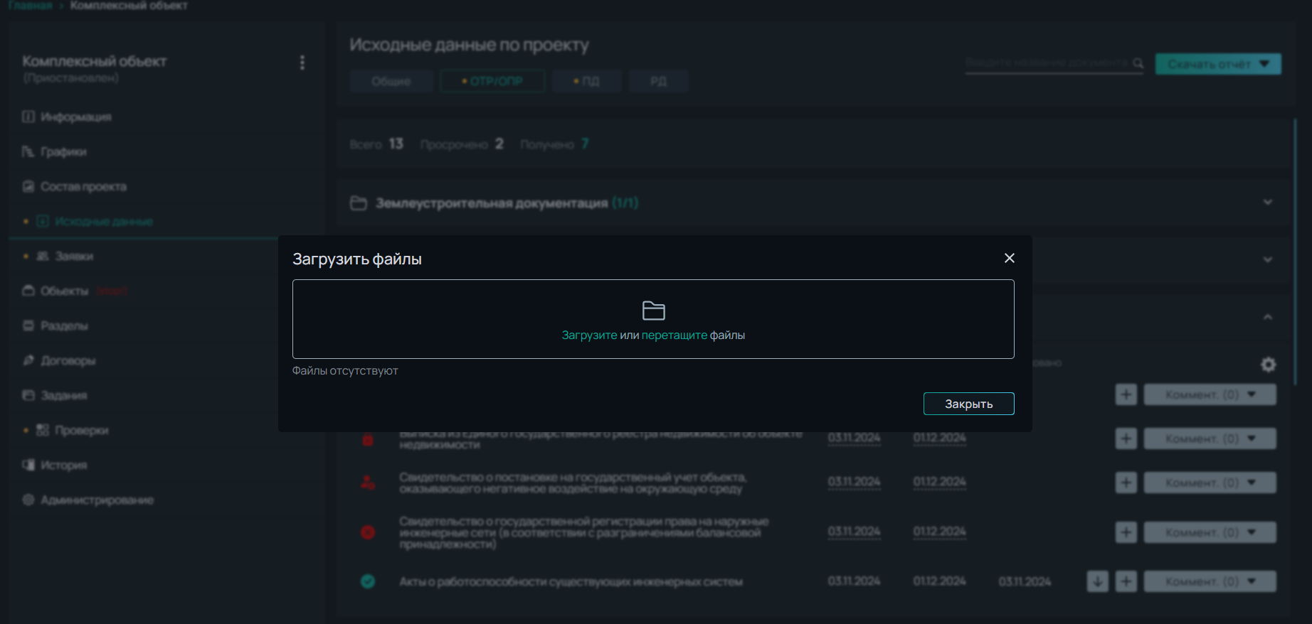 Откроется окно загрузки файлов. После вложения всех необходимых документов, нажать на кнопку **Закрыть**.