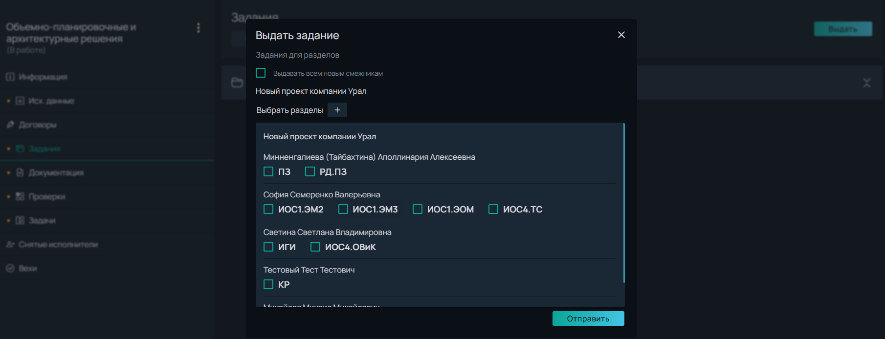 В модальной форме нужно выбрать проект и разделы из списка, нажав на кнопку "+", которым будет направлено задание.