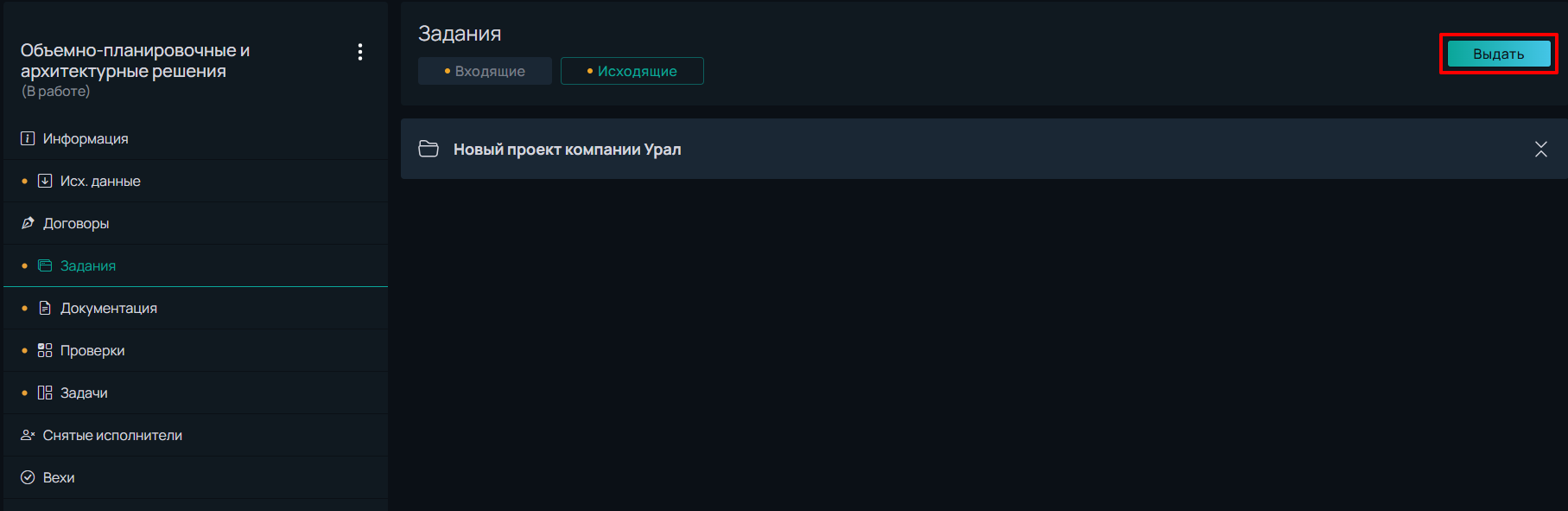 Исполнитель раздела может выдавать задания смежнику многократно, перейдя во вкладку *Задания*, блок *Исходящие* и нажав на кнопку **Выдать.**