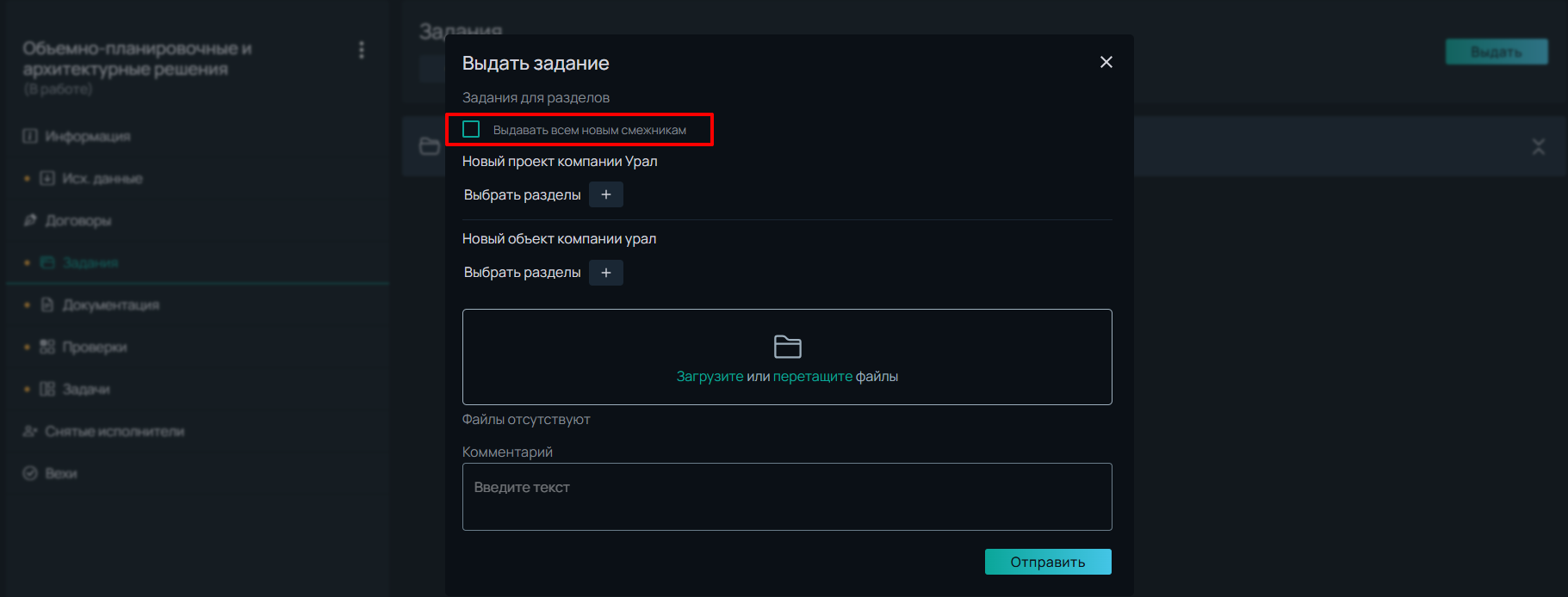 Проектировщики часто выдают одно задание для всех смежников, в таком случае нужно поставить галочку в чекбокс *Выдавать всем новым смежникам.* И если в проекте появится новый раздел, исполнителю раздела автоматически придет задани&#x435;*.*